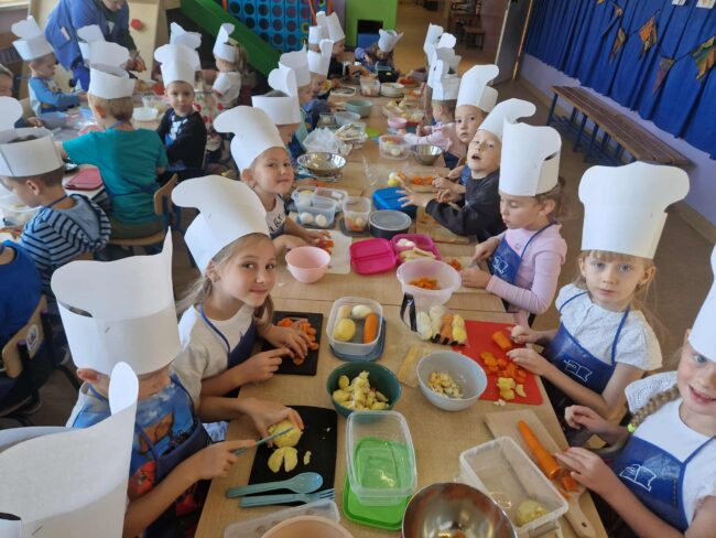 Warzywna przygoda Biedronek i Motylków! Dziś w naszym przedszkolu grupy Biedronki i Motylki wzięły udział w wyjątkowych, smakowitych zajęciach kulinarnych! Dzieci przyniosły z domu ekologiczne warzywa, z których samodzielnie przygotowały tradycyjną sałatkę jarzynową. Przedszkolaki z wielkim zaangażowaniem obierały, kroiły i mieszały składniki, a potem z dumą próbowały własnoręcznie przygotowanej potrawy. Było przy tym mnóstwo radości,…